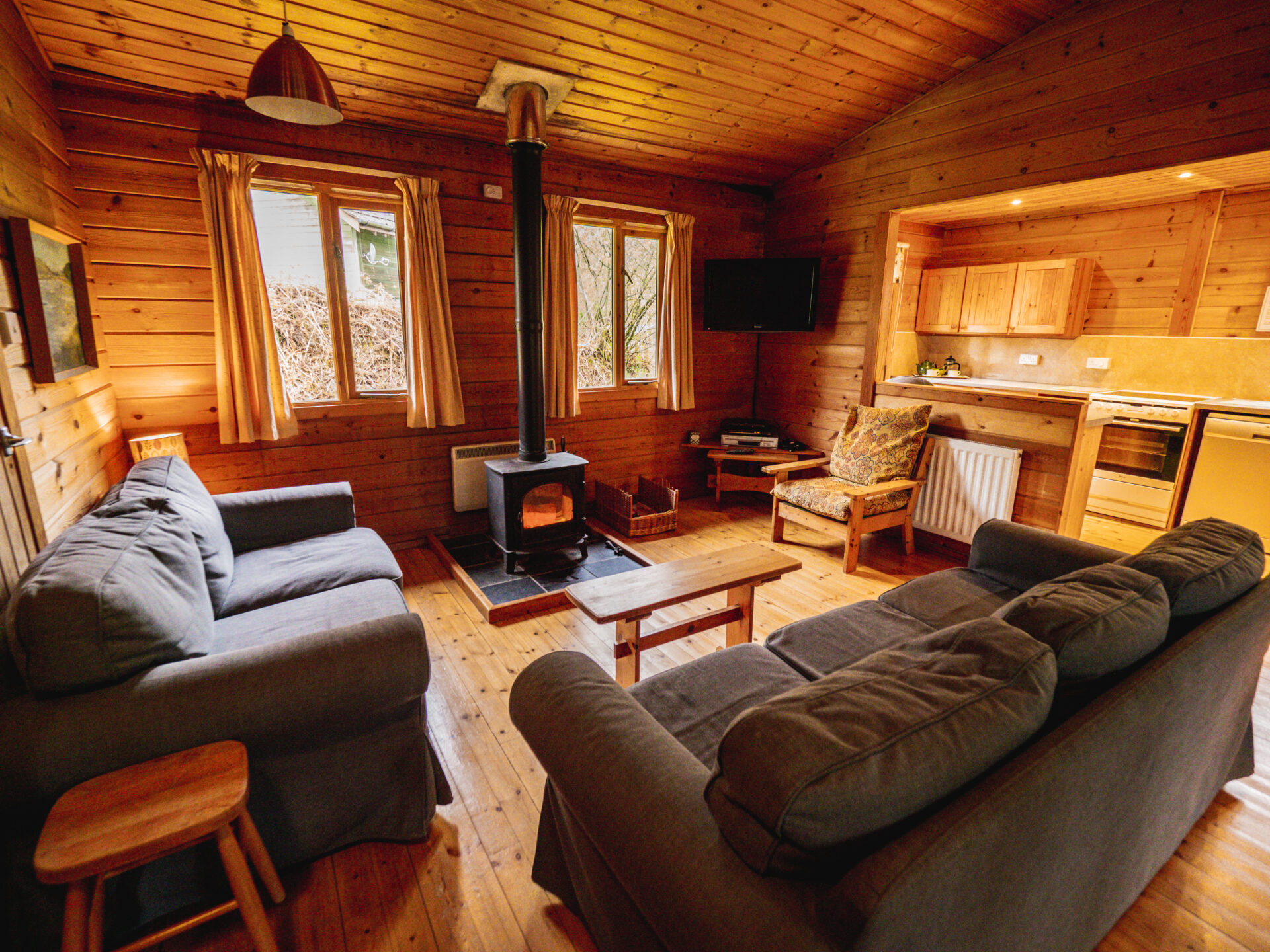 The sitting room is cosy and inviting, with two comfy sofas, a wall-mounted TV, and a wood-burner for those chilly evenings.