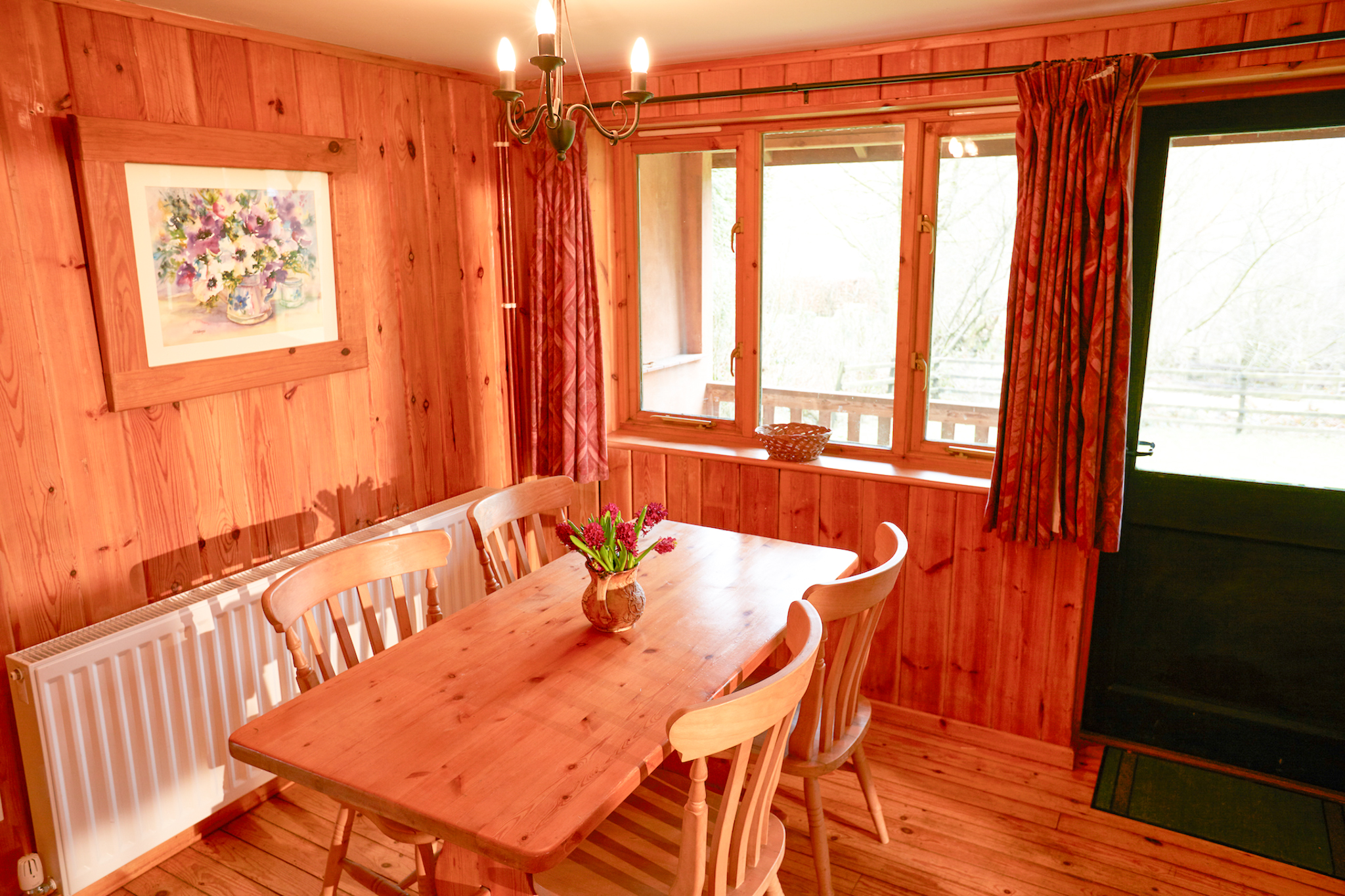 A cosy verandah overlooks the river and an ancient oak tree, perfect for relaxing outdoors. Inside, the living area features a comfy sofa, two armchairs, a TV, a pine table with chunky farmhouse chairs, and a wood-burning stove.