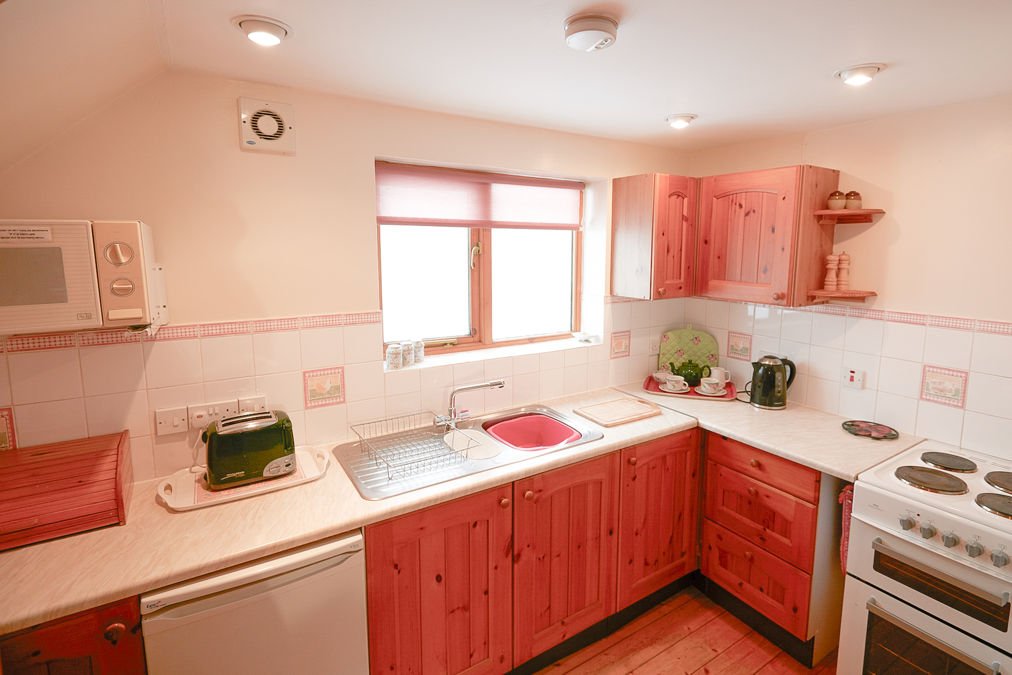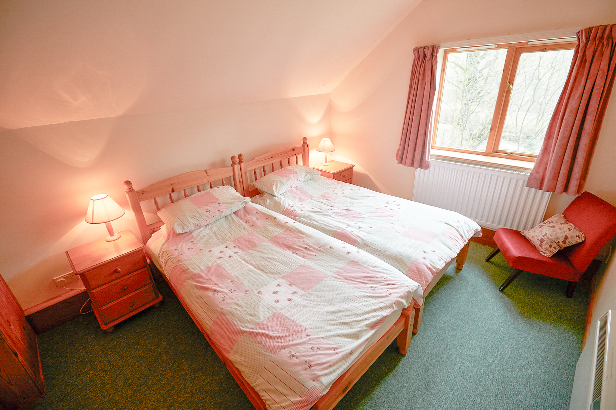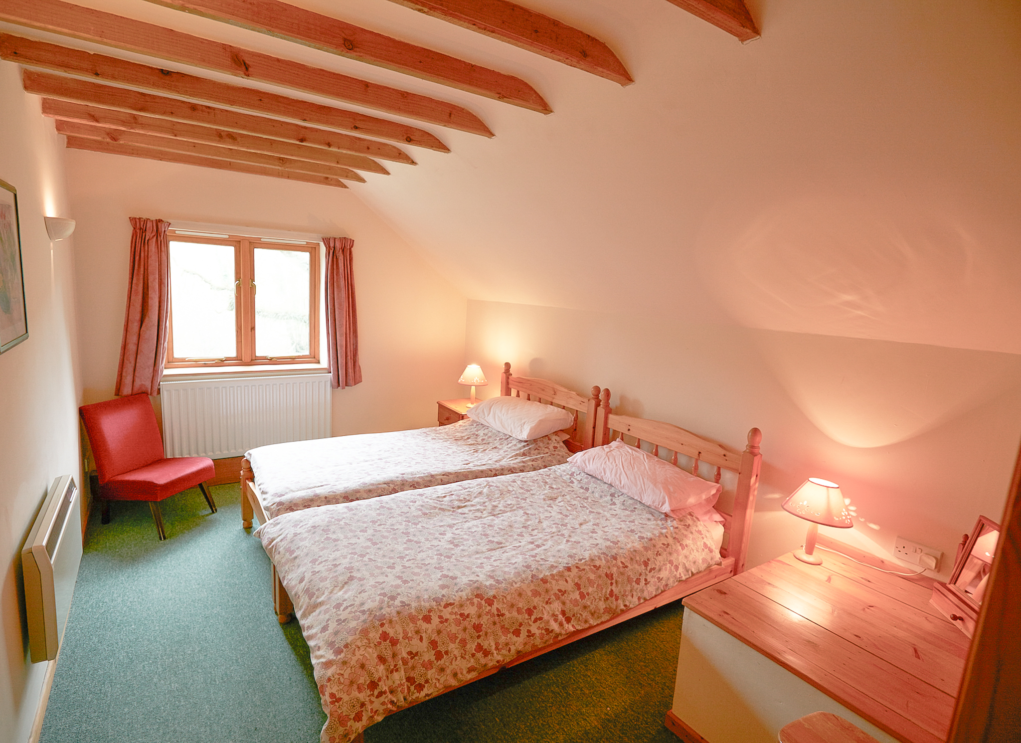 The well-equipped kitchen has wooden units, an electric cooker, microwave, and fridge, while full central heating and hot water are provided by our eco-friendly biomass boiler. Upstairs, there are two twin bedrooms with pine furniture and beamed ceilings, secured with a child safety gate at the top of the stairs.